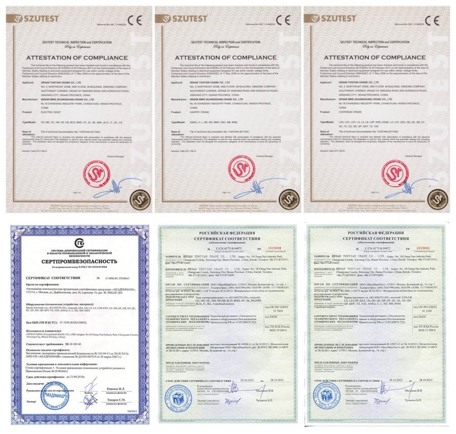 हमारे क्रेन सीई, आईएसओ, गोस्ट, एसजीएस, टीयूवी, बीवी, और इतने पर पारित किया गया है।